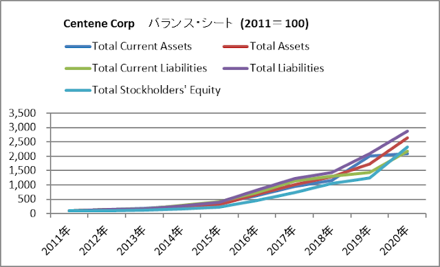 バランスシート全体を100%としたときの、流動資産(Currnet Assets:ピンク)と固定資産(Non-Current Assets:青)の構成比です。